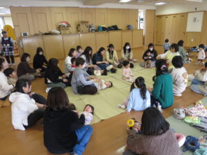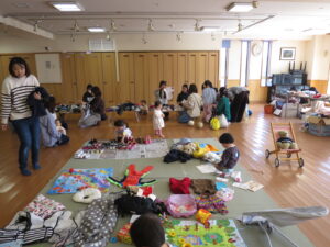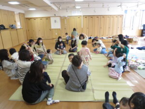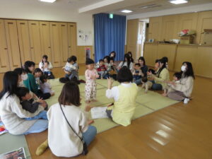 0歳~6歳の様々な年齢の親子と一緒に、わらべうたや手遊びを行いました。