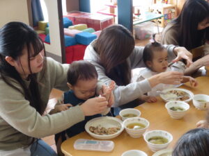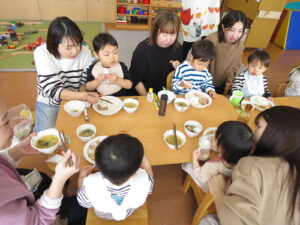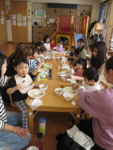 みんな、上手にイスに座ってパクパクと食べ進めていました。