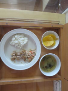 メニューは鶏の照り焼き・ごぼうサラダ・かぶとにんじん、わかめの味噌汁・デザートはいよかんです。